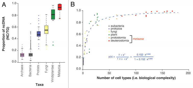 This figure from Lui et al, 2013[^lui-2013] shows the ratio of noncoding (NC) DNA to total genome size (TG) in various organisms (A) and the percentage of non-coding DNA versus the number of cell types (B).