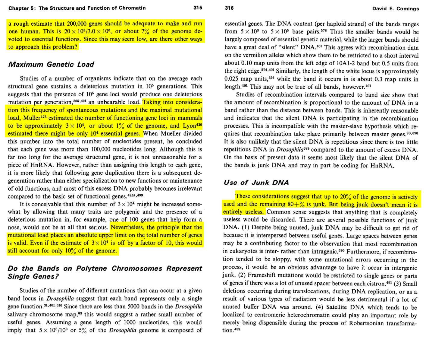 | David E. Comings, 19724 | x | x | 1 to 10% is strictly functional. 80 to 93% is junk | ||||