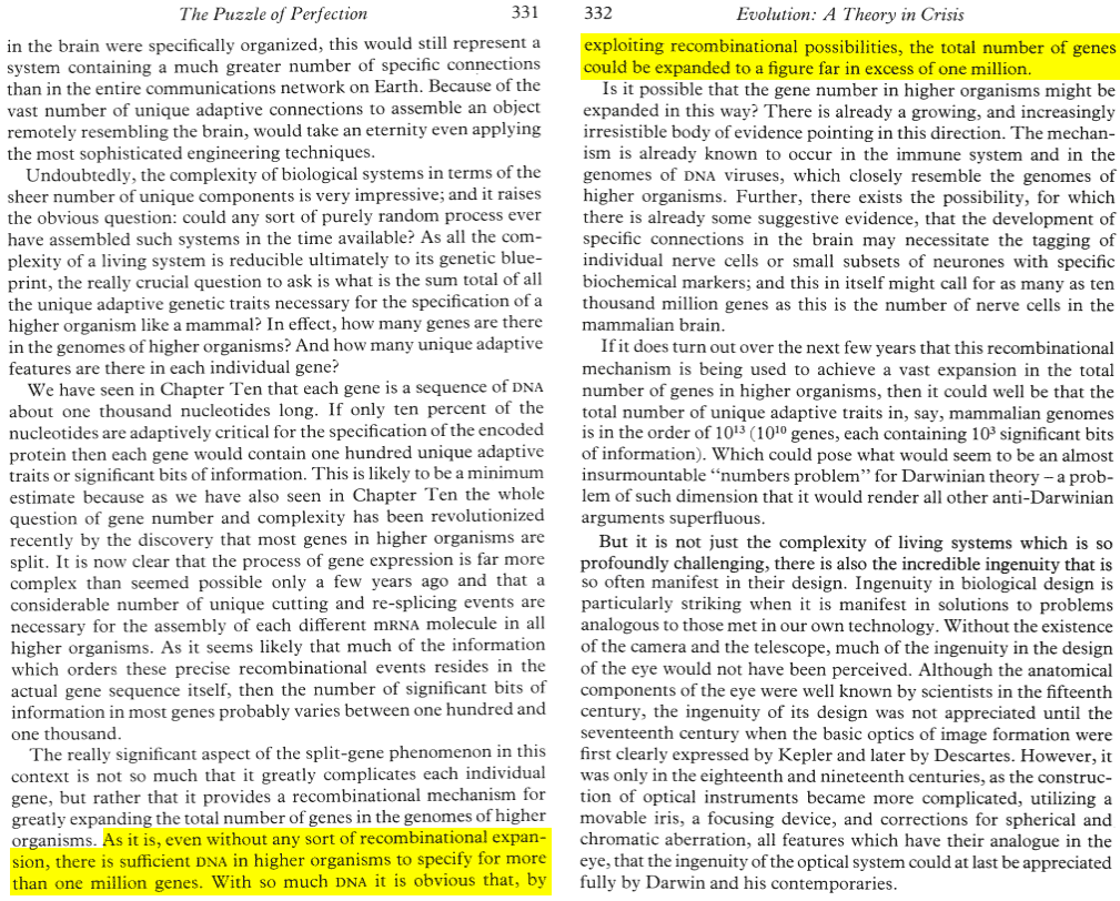 Denton, Michael. "Evolution: A Theory in Crisis." Burnett Books. 1996. Pages 331-332. Mirrors: Local screenshot. ↩