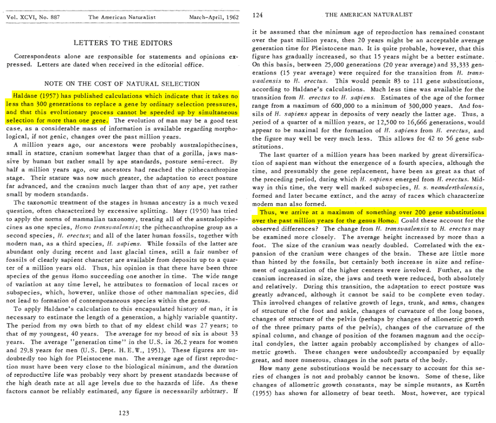 Dodson, Edward O. "Note on the Cost of Natural Selection." The American Naturalist. 1962. Mirrors: Local screenshot. JBS Haldane was an evolutionary biologist well known for his work in developing the modern evolutionary synthesis. Calculating the implications of Haldane's model, Dodson explains: "Haldane (1957) has published calculations which indicate that it takes no less than 300 generations to replace a gene by ordinary selection pressures, and that this evolutionary process cannot be speeded up by simultaneous selection for more than one gene... we arrive at a maximum of something over 200 gene substitutions over the past million years for the genus Homo. Since on average the mutation rate is the fixation rate, 300 generations with about 100 mutations per generation would give 30,000 neutral mutations per 1 beneficial mutation that fixes 29,999 / 30,000 is 99.997% of fixed mutatiosn being netural. ↩