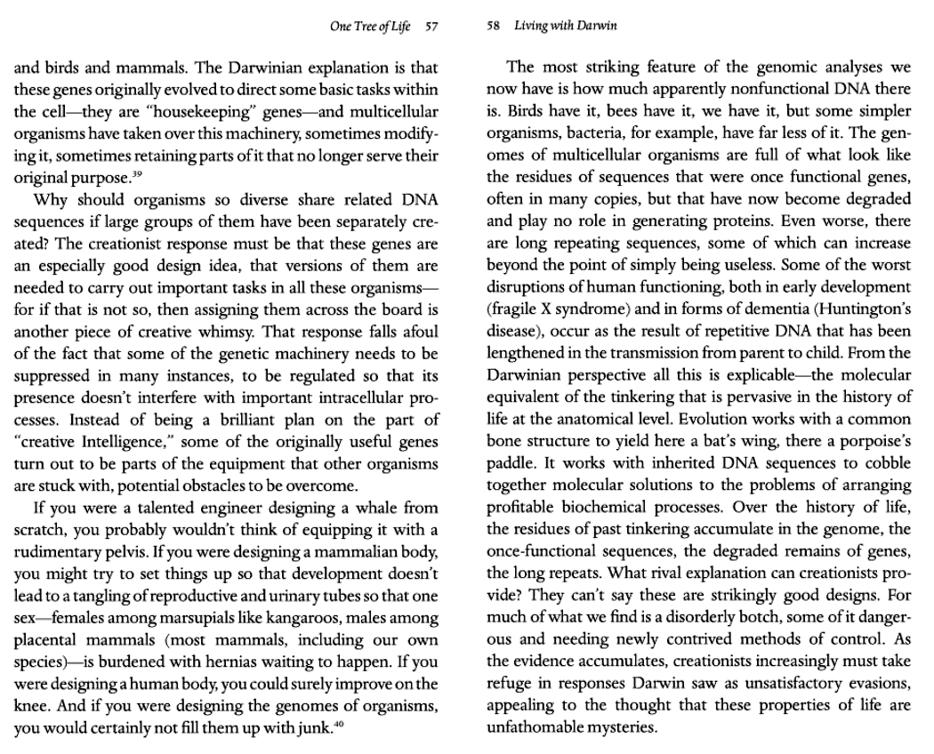 Ken Miller, 1994 Cell and molecular biologist, activist against intelligent design. In fact, the genome resembles nothing so much as a hodgepodge of borrowed, copied, mutated, and discarded sequences and commands that has been cobbled together by millions of years of trial and error against the relentless test of survival.11 |