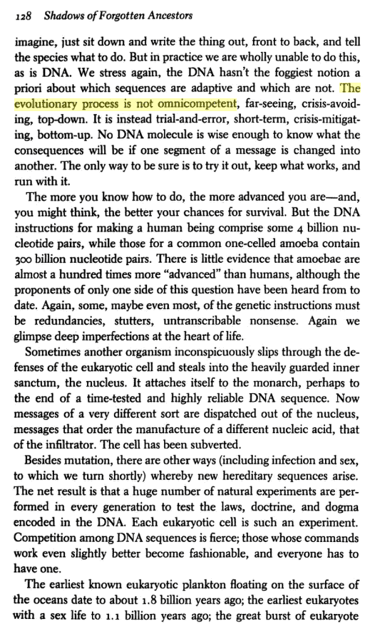 Carl Sagan, 1993The DNA instructions for making a human being comprise some 4 billion nucleotide pairs, while those for a one-celled amoeba contain 300 billion nucleotide pairs. There is little evidence that amoebae are almost a hundred times more "advanced" than humans"10 |