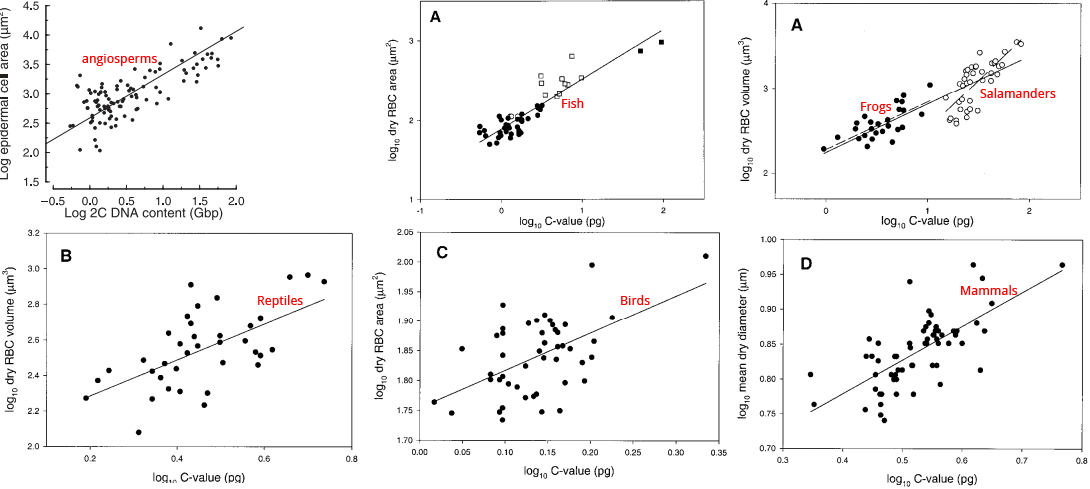 The figure below shows a correlation between genome size and cell size in various taxa, composited from Beaulieau et al 2008 figure 3[^beaulieu-2008] and Gregory 2001 figures 1 and 3.[^gregory-2001] "Angiosperms" iincludes all flowering plants, including flowering trees. Reptiles, birds, and mammals show a weaker correlation because their cell sizes vary less than the other groups.