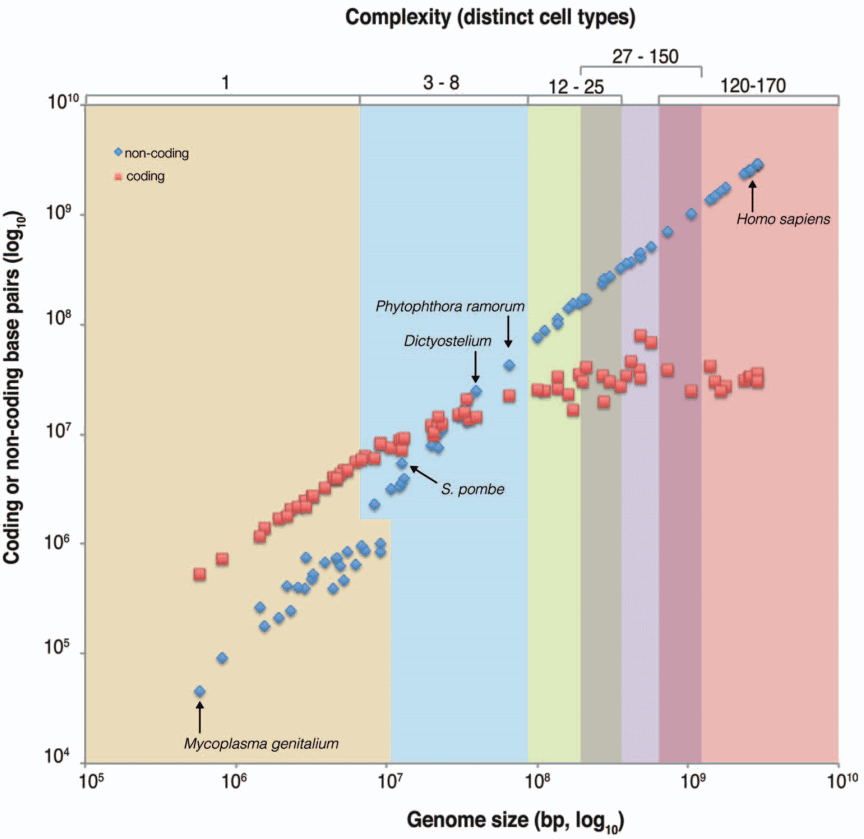 This figure from Lui et al, 2013[^lui-2013] shows the ratio of noncoding (NC) DNA to total genome size (TG) in various organisms (A) and the percentage of non-coding DNA versus the number of cell types (B).