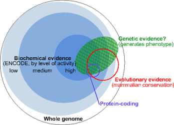 Many tests for function do not overlap other tests. This chart21 illustrates the intersections of some of the tests. Note that almost all DNA is colored by at least one test of function:
